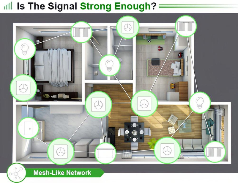 Neither do they require a central hub or element that picks up the signals of all the connected switches, since they can function as a network in the form of a mesh, each element becoming a node capable of expanding the coverage and thus extend control throughout the house exceeding the initial range of a single Bluetooth link.