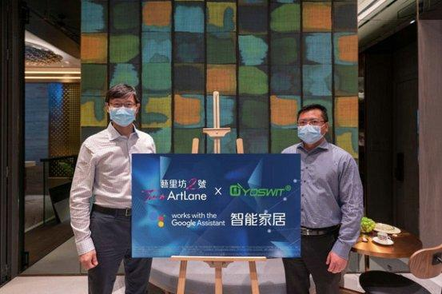 ■韓家輝(左)表示,「藝里坊‧2號」所有單位均引入Yoswit智能家居系統;圖右為嶺勤科技的創辦人之一吳啟鍫。